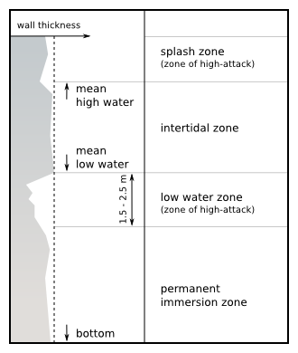 The following qualitative diagram of corrosion zones in salt water is taken from Figure R 35-1 from the Committee for Waterfront Structures Harbours and Waterways (EAU) 2004 handbook section 8.1.8.1.